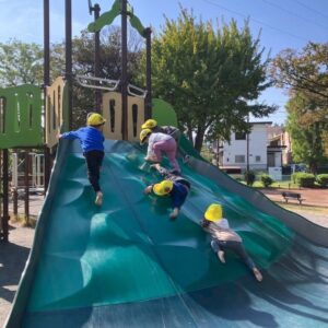 小さい子達が大きな滑り台で一緒に遊んでいる風になりました。勿論、チューリップの年長、年中さんはわかっていてもそのままです。こちらもぶつかったりしないように見てはいますが、それは公園遊びに長けている子どもたち!チューリップ同士では「入っちゃダメ」「こないで」と言いますが、知らない小さい子には言いません。自然に社会性が育ってるなと感心しました。