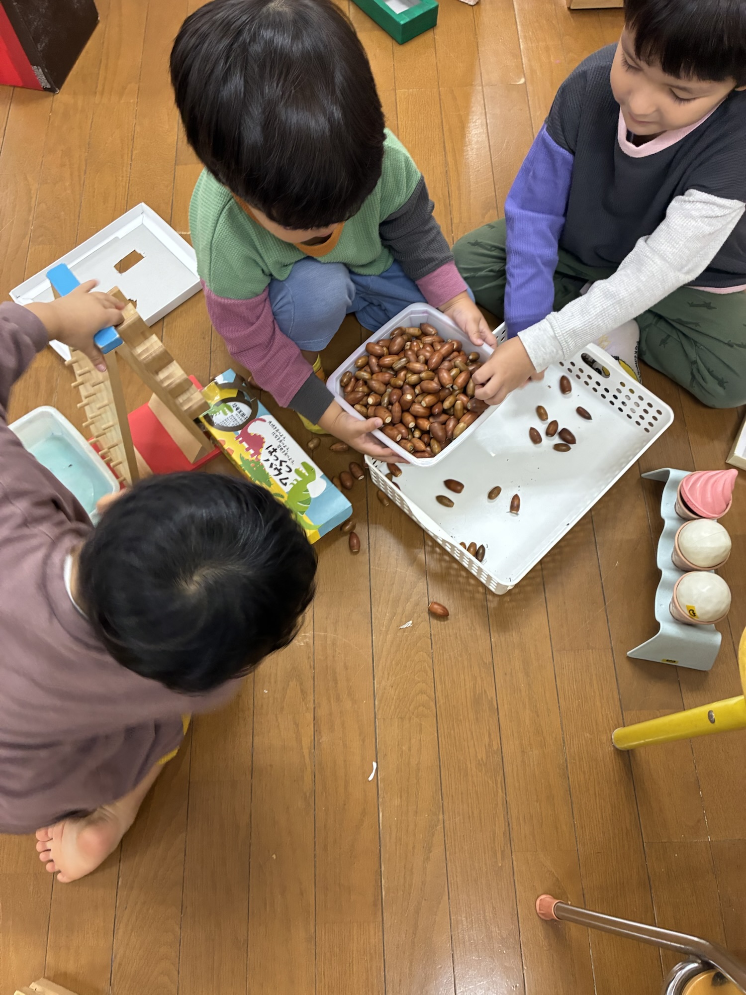 台風が過ぎ去って不安定なお天気でした。今日は前半後半に分かれて宮前平公園に行きました。嵐のあとなのできっと、どんぐりが落ちているだろうと予想して、どんぐりひろいをすることに。青くて小さなどんぐりがたっくさんおちていました!それで、どんぐりスープ、どんぐりだんご、を作るひまわり組(年中、年長)でした。