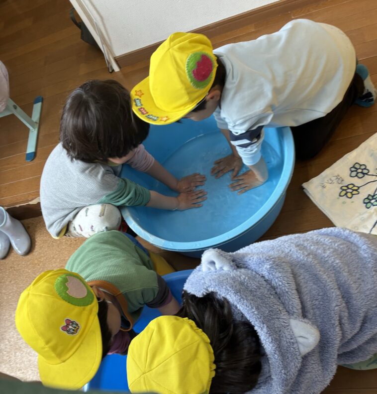 年長さんは卒園に向けて、いろいろと作業があって朝の自由遊びの時間から、隠れた場所で4人でやりました。他の子が覗こうとすると「だめ~」と大喜びで言う年長Aちゃん。(笑)1時間以上作業を会話をしながら楽しく続けている姿は、やっぱり年長さんだなと感心します。