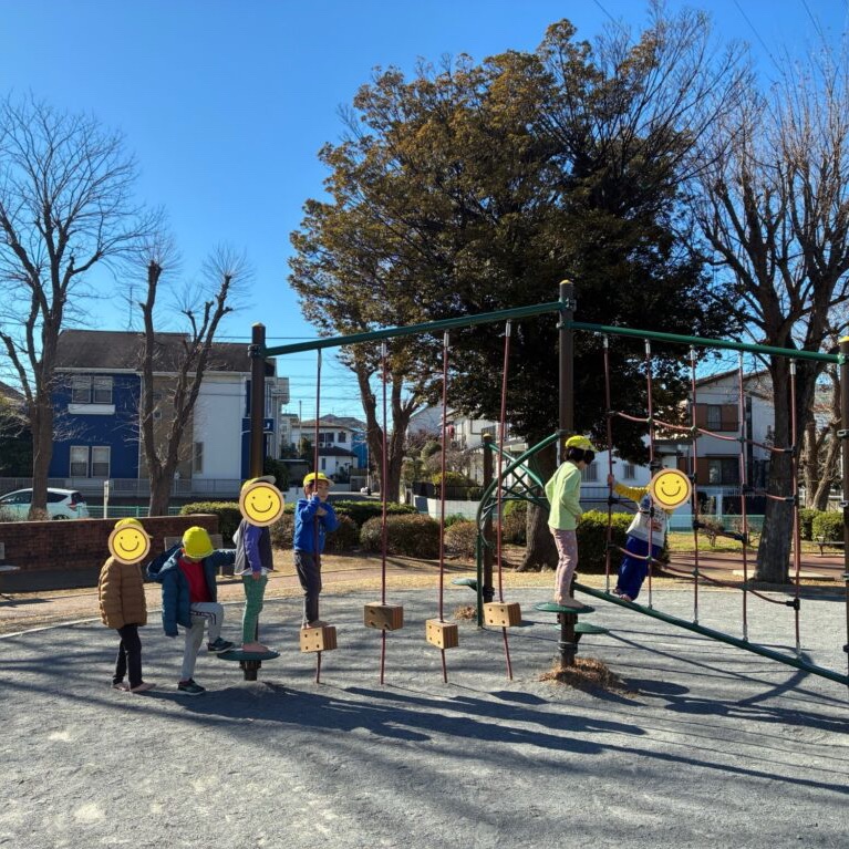 先に乳児さんたちで公園に行きました。しばらく遊んでいると、幼児組とひでちゃんが来ました。幼児組とひでちゃん、大きな声を出して追いかけっこをしてとても楽しそう。それを見て2歳児のKちゃんは、私の手を引っ張って歩き、ひでちゃんのそばに近づいて行きました。すごく気になるようです。一人で近づく勇気はないけれど誰かと一緒なら安心なのかな。近くにいてみんなの様子を覗き込むように見ていました。
