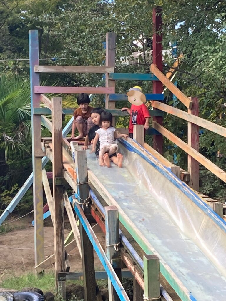 今回、2歳児Hちゃんがお母さんと一緒に行きました。初夢パークです。どんな風に遊ぶかな?と、見守っていたら、自らどんどん遊びを見つけて、裸足で山に登ったりターザンロープにも挑戦しようとしたり(いざやろうとしたら「やっぱりこわいからやらないと、降りました。これも自分で決められて素晴らしい事です)、皆んなが行くウォータースライダーへも上って行きました。