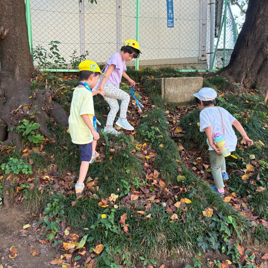 公園から帰る時に、小学生の脇の段の上をプチ冒険で登ります。年中K君はいつもやらないのですが、今日は年長Rちゃんに誘われて、初めて登りました。子ども同志の関係が深いからできたことだと思います。本人も周りのみんなも嬉しい出来事でした。