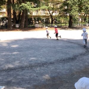 リレーは二回走ってみてました。年少さんはトラックの周りを走る事と、バトンを次の人に渡すのが難しそうでした。毎日のように、なわとびや走ることを繰り返してみます。できないけれどやってみる=挑戦すること、をみんなで盛り上げていきます。口で言うだけでなく、ご家庭でも週末などに、公園でなわとびの練習をするのもよいと思います。