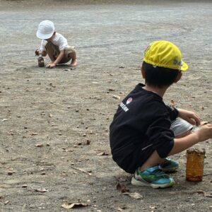 運動会ごっこも少しして、その後は宮前平公園で1時間以上自由に遊びました。沢山落ちているどんぐりを拾って、私が滑り台から転がしました!わーーと歓声があがって真似をします。そんなことしていいの?という気持ちもあったかと思いますが、公園に他の子がいたり大人の厳しそうな目があったり周りの状況によってはできないことかもしれません。でも誰にも迷惑をかけないのとであれば、滑り台の反対登りもどんぐり転がしもやっていいと思います。これやってみたい!の意欲をなるべく叶えて、どんどんぐんぐん伸び伸びと遊んでほしいのです。〜していい?と保育士に聞くのではなく、ね。