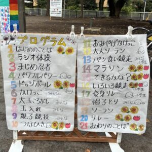 いつも宮前平でやっている運動を子ども達がやってみせ、お母さんお父さんも同じ競技に参加してくれたりしました。
