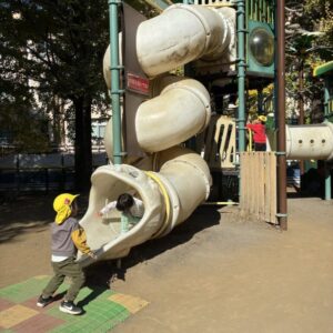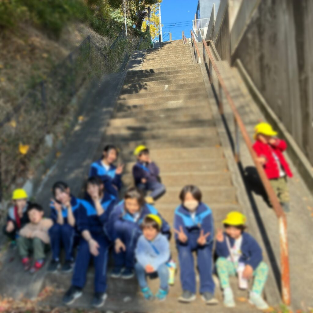 蛇公園に行くことが決まり、今日はお姉さんと繋いでいい日になり、自分から繋いでと言ったりいつもと違う顔もみられました。スピードを出して歩き、蛇公園では滑り台、ブランコ、鉄棒など『お姉さんたちと一緒に』遊びました。みてみてーと少し高いところからジャンプした年中A君。お姉さん達にすごーい!!!と拍手され嬉しさと恥ずかしさでそのまま走ってどこかへ行ってしまいました。