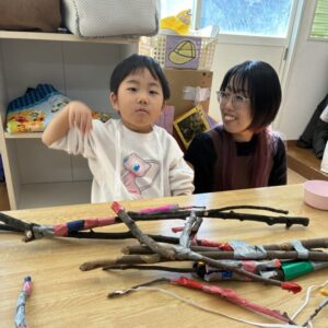 武器やさん:公園で拾ってきた木の枝を使った弓や剣を売っています