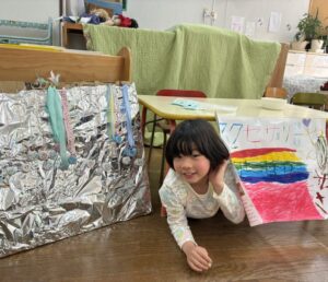 今日までひまわり組の子どもたちは、集中し時間をかけて、それぞれこだわりを持ってお店の商品を作り看板を作ったりお金を作ったりしてきました。