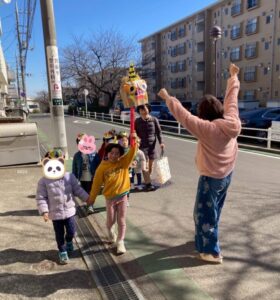 今日は節分で鬼のお面をつけての豆まきです。大人(保育士)も、それぞれの3人も鬼のお面を作りました。子どもたちはいつもの帽子を鬼のお面に変えて宮前平公園に!
