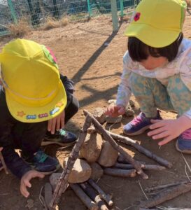 今日は節分で鬼のお面をつけての豆まきです。大人(保育士)も、それぞれの3人も鬼のお面を作りました。子どもたちはいつもの帽子を鬼のお面に変えて宮前平公園に!