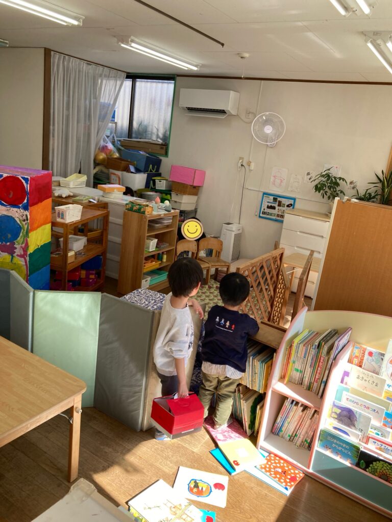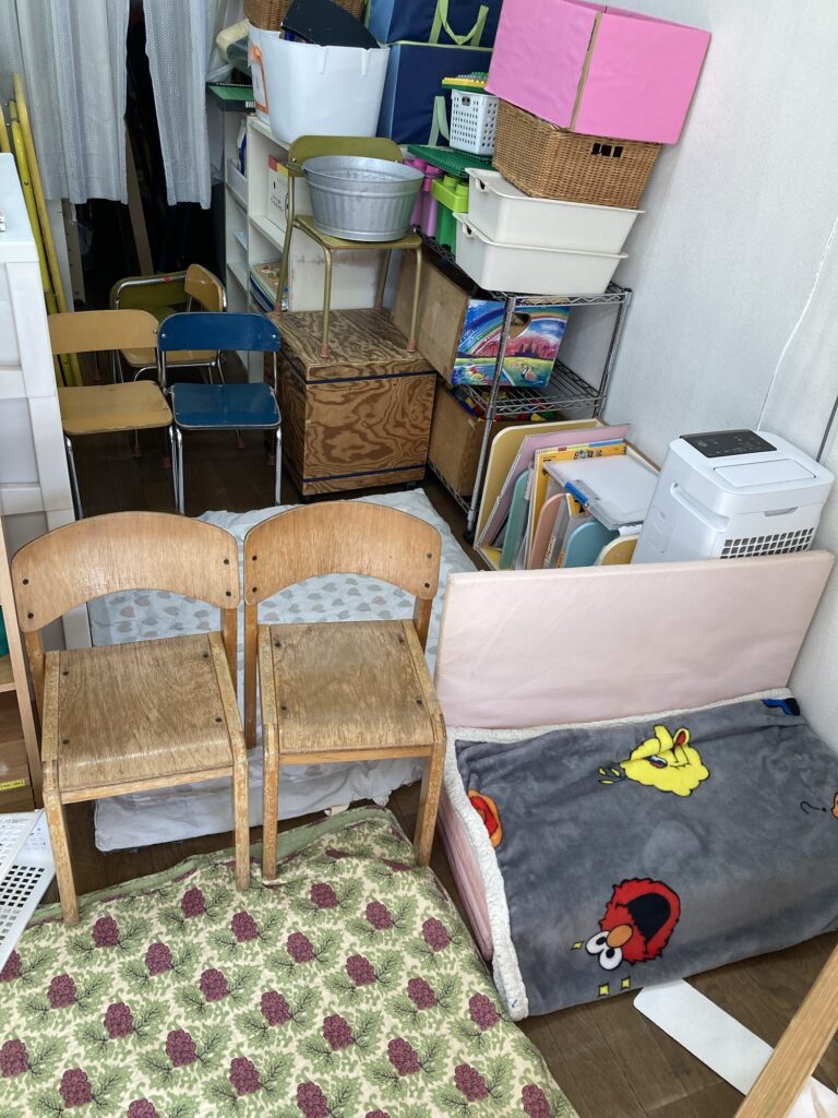 ここにおままごとの、ジュースやお鍋の中身トング、器などを持ってきて、自分たちの居場所のように過ごしています。