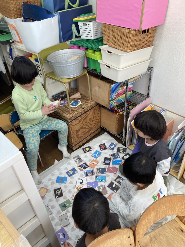 途中で、どちらが先に取ったのか微妙な時があったようで、ジャンケンをしていました。『最初はグー、じゃんけんぽん!』の声が聞こえると、2人で遊んでいた年中Kくんと年少Tくんもそちらを覗いています。