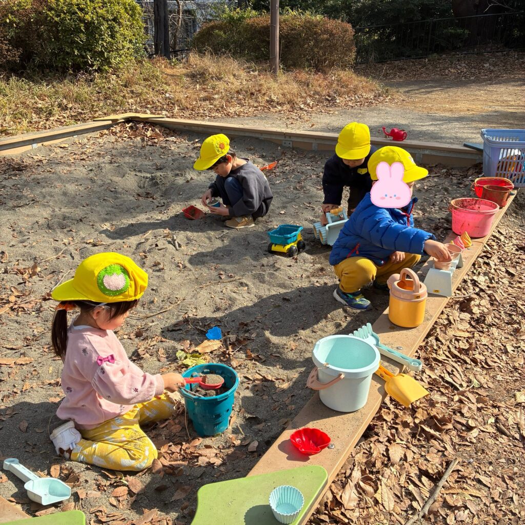 小さい男の子たちは工事の車に砂を乗せて運んだり、お水を汲んできて砂に混ぜてアイスやケーキを作ったりと夢中で遊びました。