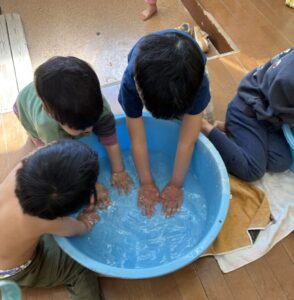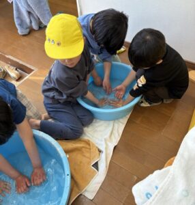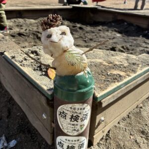 雪遊び 投稿日 2026年2月9日 著者 tulip-room カテゴリー 園日記 昨日、日曜日に雪が降りました。子ども達は喜んだことと思います。公園にも少し雪が残ってるので宮前平公園に行きました。日陰や木の下にはゆ雪があり、雪玉をつくって雪合戦を少しだけしたり、小さな雪だるまを作ったりしました。 雪を触ると手が冷たくなって真っ赤になります。お部屋に戻ってお湯であたためました。全員タライに手をいれて「あったかーい」と嬉しそうでした。 最近流行りの椅子テーブルでお昼ご飯を食べました。 しお この記事を書いた人 tulip-room 記事一覧