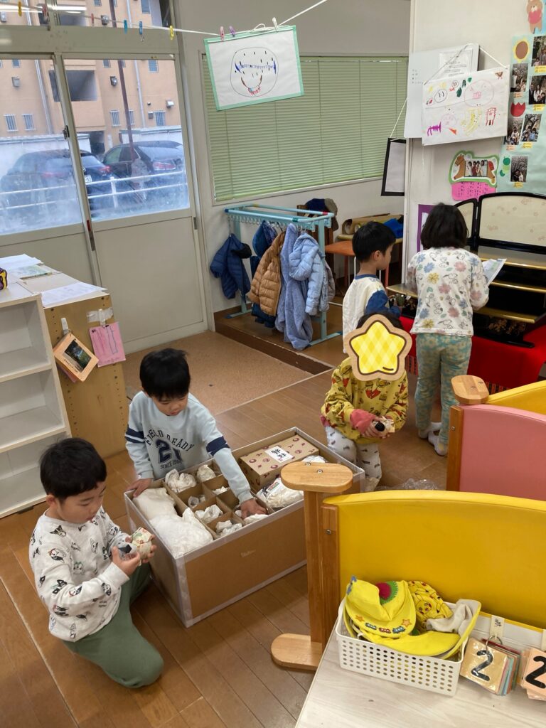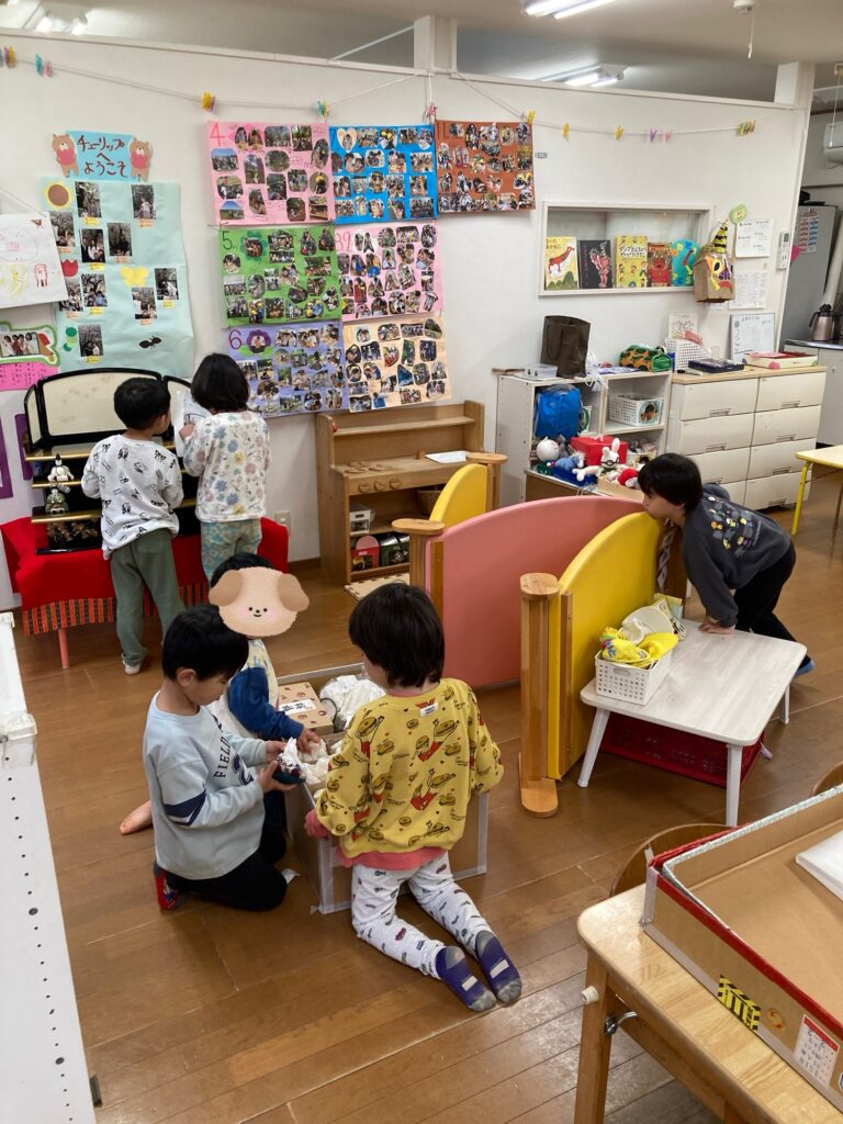 仕切るのはもちろん年長Rちゃん。『あ、これはねここだよね』『Tちゃん、持ってるお人形ここに持って来て』『Kくん、(袋から)出せる?』と、目の前で対応している子を見ながら他の子が困ってないか…まで、目配り気配りがすごいです。途中『ひな祭り』の歌もうたっていました!