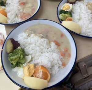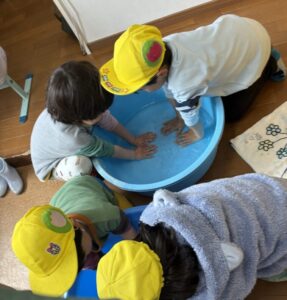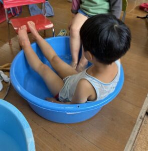 お部屋で足湯を用意して入ります。2歳児さん、年少さんは足もいれて、しゃがんだりとくつろいでいました。年中さんも足湯をするのかと思ったのですが(そこは自由)、年長Rちゃんがやらなかったので、年中A君以外はやりませんでした。やらないで、と指示したわけではないのですが同じことがしたい、何か言われたらいやだという気持ちがあるのだと思います。子どもたちの関係は正解はなく、誰かが困っていたり嫌がっていたら言葉をかけることもありますが、基本的には見守っています。大人が介入しない分、自分で考えて行動すること、人のせいにしないことが、できていると感じています。子どもたちの関係をみていて大人も同じだなぁ、と学ばせてもらっています。