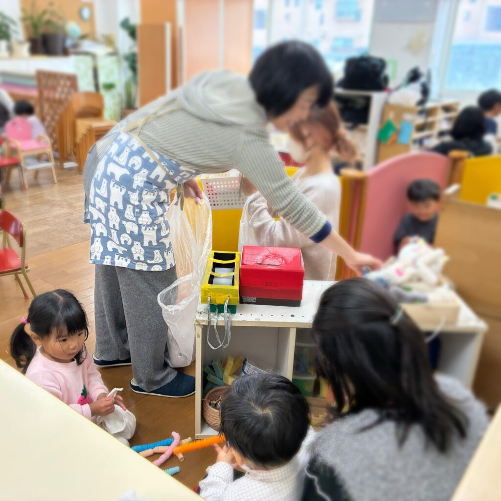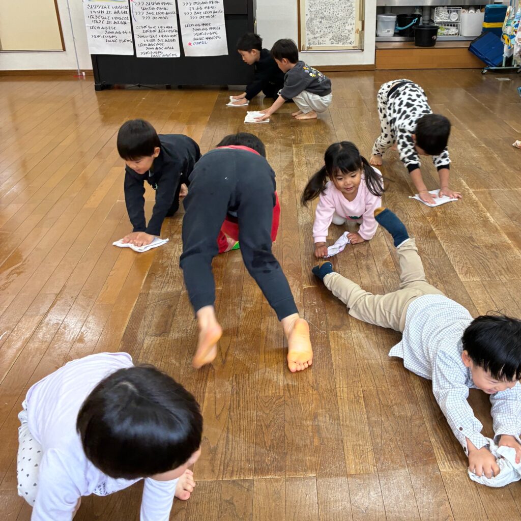 お家から掃除道具をもってきてもらっての親子掃除。小さい子も椅子を拭いたり、お掃除をする、とわかっていました。大きい子たちは慣れたもの!お母さんと一緒にきれいにしてくれました。最後は一列に並んでの雑巾がけ!お兄ちゃんの小学生を先頭に楽しくやりました。